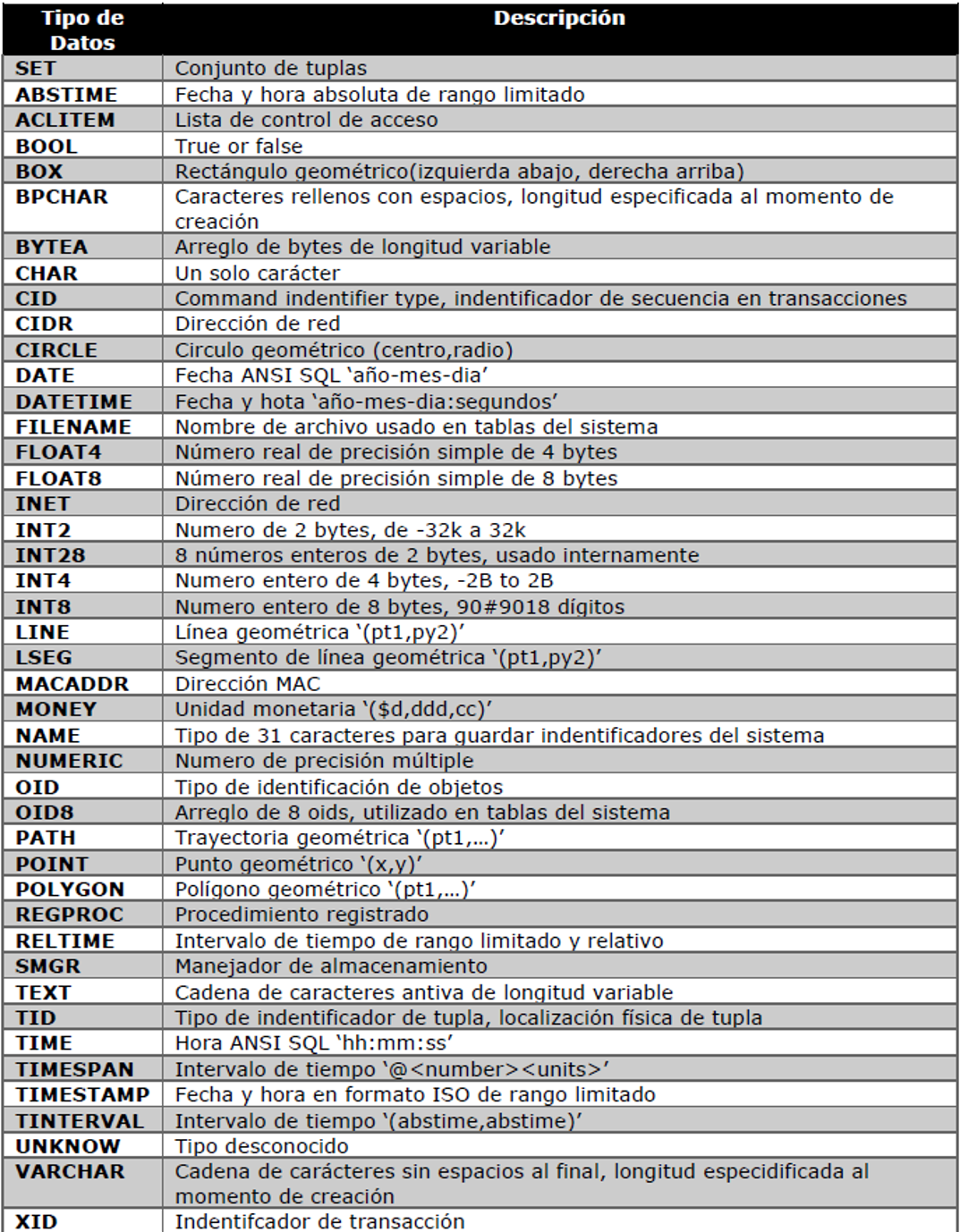 Tipo de datos de PostgreSQL