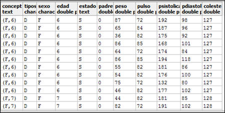 El código anterior crea una estructura de tabla, con tres columnas (concepto, intervalo de presión sistólica e intervalo de presión diastólica), la misma puede ser invocada posteriormente mediante un select * from TablaEstudios.